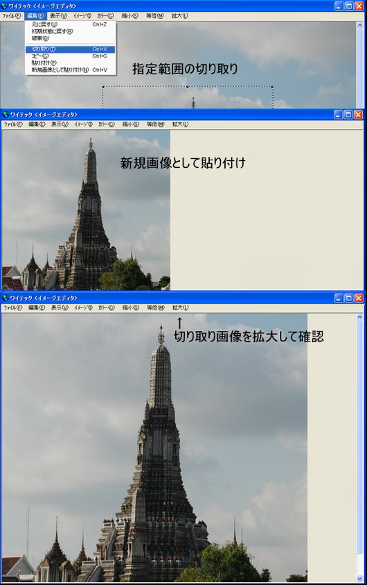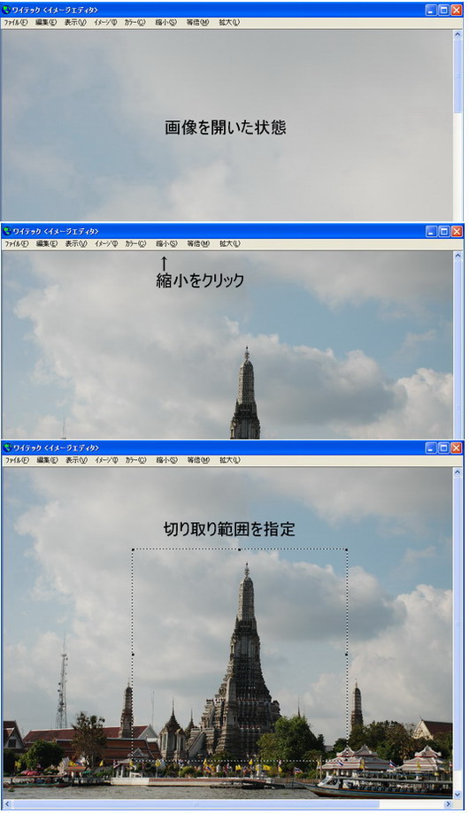 原画像を直接編集しますので画質は原画像のままです。例えばデジタルカメラ等の大きなファイル画像を開いた場合編集画面をオーバーフローしてしまいます。簡単操作で縮小し、原画像の画質で切り取り編集が可能です。