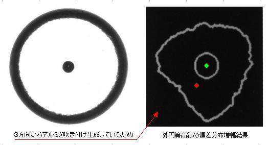求めた等高線より中心位置を計算し、偏芯の検査をした例です。