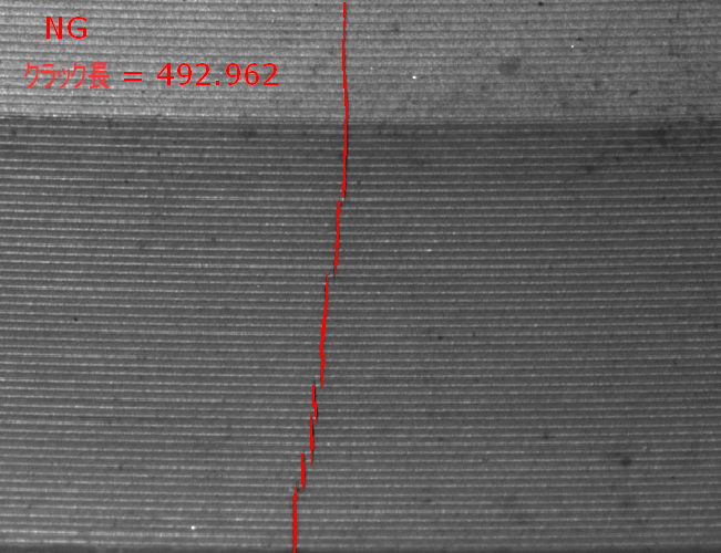 被写体を回転しながらカメラでスキャンし分布よりクラック領域を計算し、クラック長で判別して検査しております。 ・・・ 肉眼で見つけるには困難なサイズです。