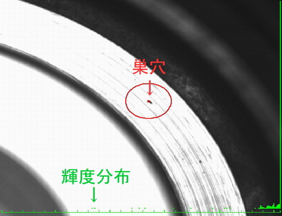 被写体を移動しながらカメラでスキャンし輝度分布より巣領域を計算し形状特徴量・面積値等で判別して検査しております。 ・・・ 肉眼で見つけるには困難なサイズです。