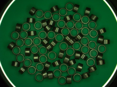 深さ300mm先まで見えるテレセントリックレンズにて触媒筒内部上面より底面まで目詰り・欠損等を検査した例です。画像を取り込み輝度分布より最適なしきい値を決定し領域を生成、面積・形状特徴量により製品検査をしております。