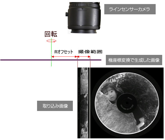 例えば半径が500mmのオブジェクトの径を測定したい場合は撮像範囲を外周10mm位の範囲に絞って回転し画像を取り込みます。取り込み画像を極座標変換し生成した画像より測定すれば高精度の径測定が可能となります。