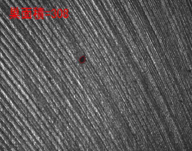 本事例は500万画素カメラにより視野40×53mmの静止画像を取り込み、検出精度を上げるため更に世界座標系画像に変換して径60ミクロン程度の巣穴を検出しております。