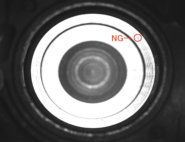 深さ300mm先まで見えるテレセントリックレンズにて触媒筒内部上面より底面まで目詰り・欠損等を検査した例です。画像を取り込み輝度分布より最適なしきい値を決定し領域を生成、面積・形状特徴量により製品検査をしております。